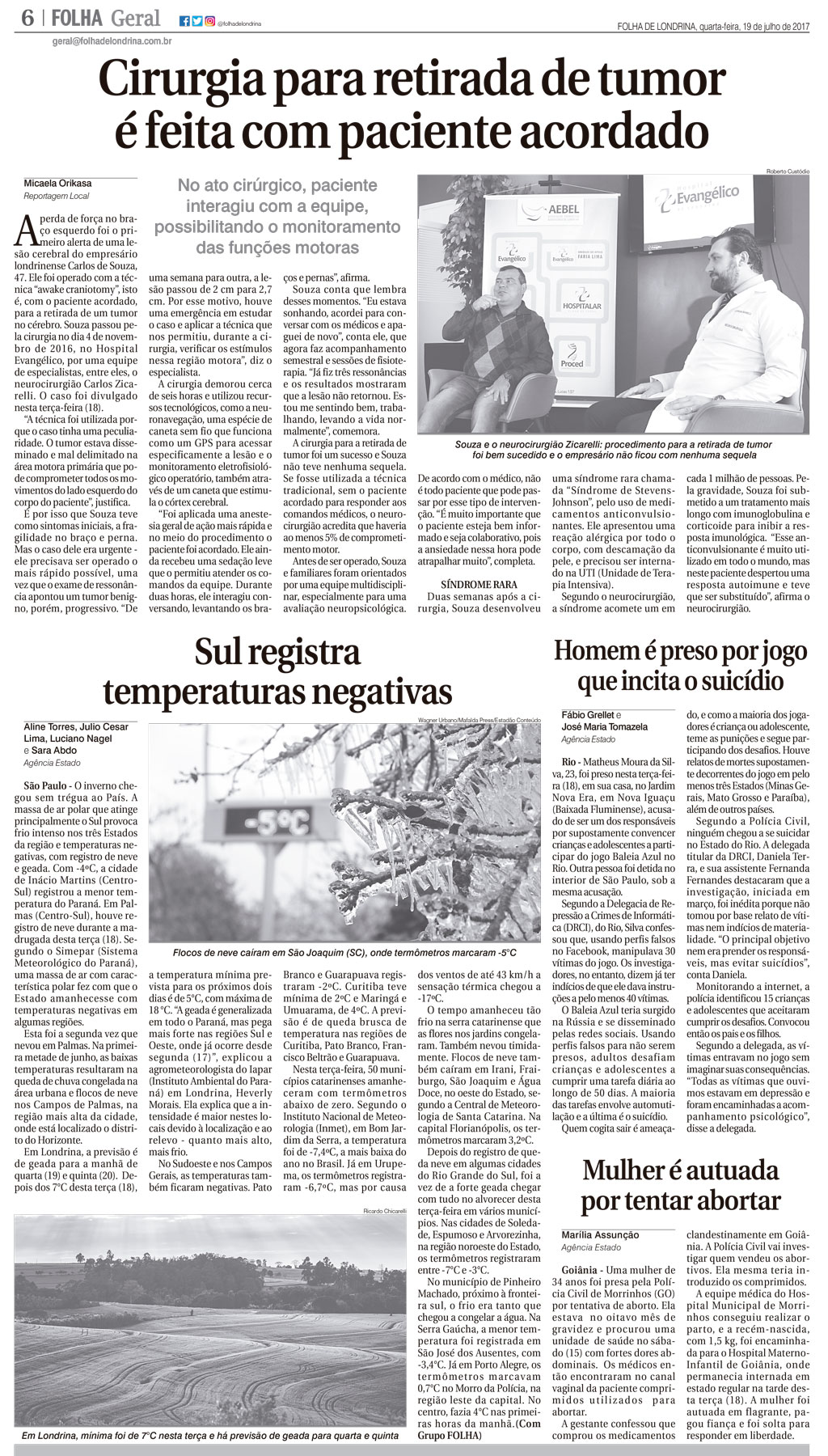 A perda de força no braço esquerdo foi o primeiro alerta de uma lesão cerebral do empresário londrinense Carlos de Souza, 47. Ele foi operado com a técnica “awake craniotomy”, isto é, com o paciente acordado, para a retirada de um tumor no cérebro. Souza passou pela cirurgia no dia 4 de novembro de 2016, no Hospital Evangélico, por uma equipe de especialistas, entre eles, o neurocirurgião Carlos Zicarelli. O caso foi divulgado nesta terça-feira (18).