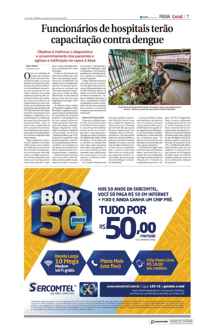 O risco de epidemia de dengue em Londrina levou a Secretaria Municipal de Saúde a convocar diretores de hospitais da cidade para discutir procedimentos de atendimento de pacientes com suspeita de ter contraído a doença. Em reunião realizada na sede da AML (Associação Médica de Londrina), nesta terça-feira (5), os representantes do setor definiram que profissionais das instituições que atendem pelo SUS (Sistema Único de Saúde) receberão treinamento para melhorar o diagnóstico, o encaminhamento e a notificação dos casos à Sesa (Secretaria de Estado da Saúde). Entre as ações estão a capacitação in loco, por parte da secretaria, dos profissionais das instituições quanto ao manejo clínico dos pacientes diagnosticados com a doença.