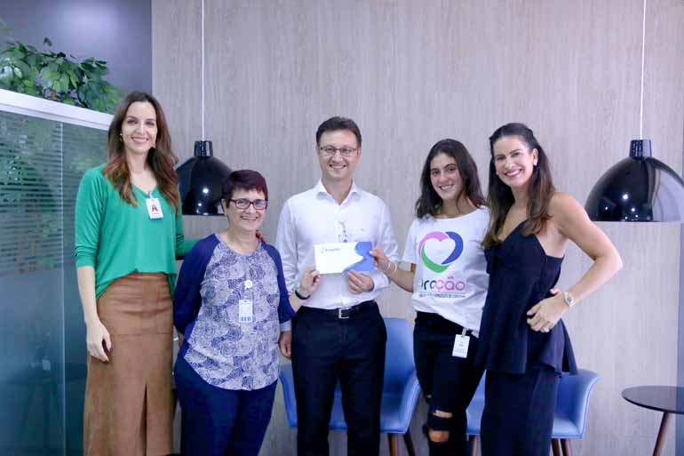 Uma das protagonistas da agenda das festas de 15 anos, em 2018, Geórgia Touma deu belo exemplo. Ela e a mãe, Manu, que cuidou de todos os detalhes da festa, pediram aos convidados, em vez de presentes, doações para o Hospital Evangélico de Londrina. O montante recebido foi entregue à instituição e será destinado à reforma da ala materno-infantil. Manu faz parte do grupo Oração que dá apoio ao HE Londrina, que atende 60% de pacientes do SUS. A obra vai custar R$ 350 mil, valor este arrecadado ao longo de um ano. O compasso, aliás, é de agradecimento. Na foto, Manu e Geórgia aparecem com Rafaela Marinho, Lourdes Marques e Fábio Pozza, do Hospital Evangélico
