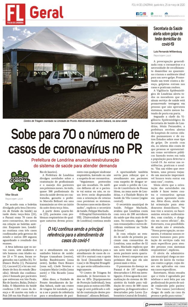 Número de casos confirmados de coronavírus sobem para 70 no Paraná