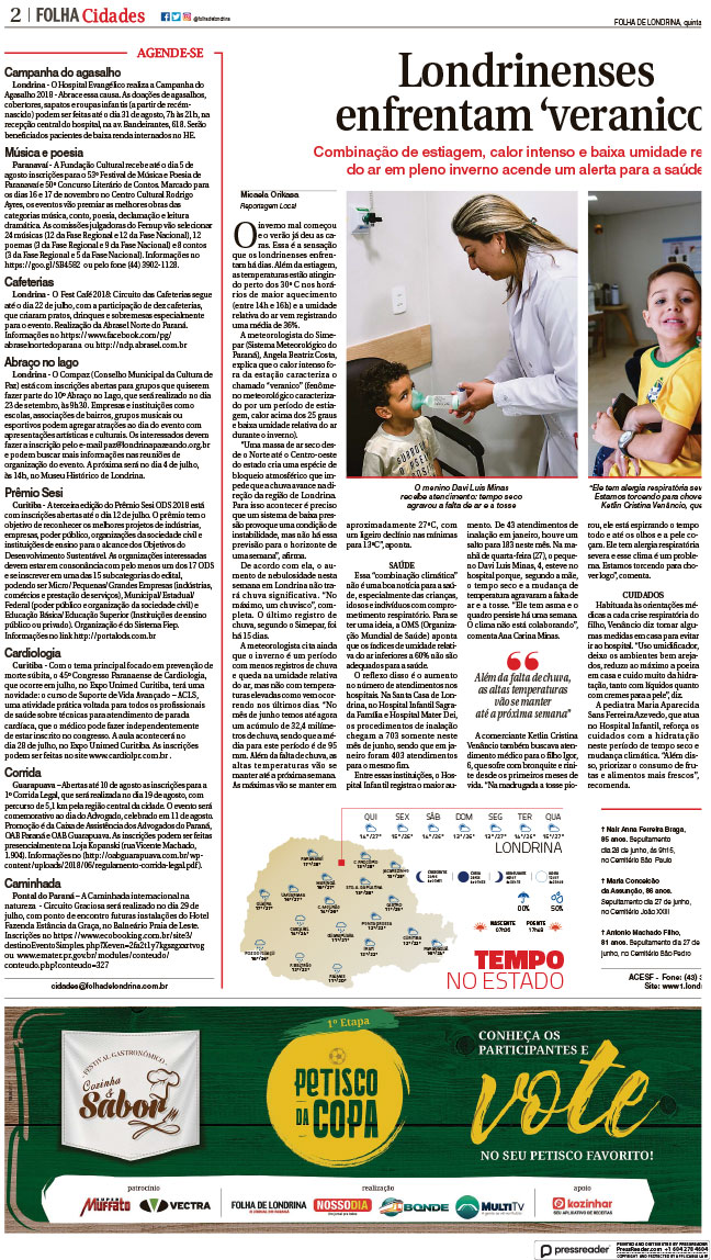 O Hospital Evangélico realiza a Campanha do Agasalho 2018-Abrace essa causa.As doações de agasalhos, cobertores, sapatos e roupas infantis (a partir de recém- nascido) podem ser feitas até o dia 31 de agosto, 7h às 21h, na recepção central do hospital, na av.Bandeirantes,618.Serão beneficiados pacientes de baixa renda internados no HE.
