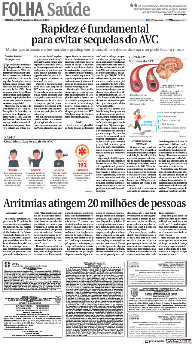 A instituição realizou uma campanha de aferição de pressão e divulgação das formas de reconhecer o AVC em Londrina. O servidor público Adriano Kiiller buscou atendimento para se informar melhor sobre a doença. “Fiz 40 anos este ano e sei que preciso me cuidar”, afirmou ele, que não tem hábito de ir ao médico, mas quer incluir essa rotina no estilo de vida.